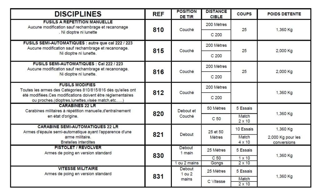 Les épreuves se pratiqueront au fusil à 200 mètres, à la carabine 22 LR à 50 mètres et aux armes de poing à 25 mètres pour lesquelles on utilise des armes d’origine militaire devenues aujourd’hui obsolètes et classées selon la nature des munitions en 1ère, 4ème, 5ème et 7ème catégorie. Il y a 4 épreuves au fusil 200 mètres : fusil a répétition manuelle, semi auto 222/223,semi auto autre calibre,et fusil modifie .1 épreuve carabine 22 LR et 2 épreuves pistolet / revolver et vitesse militaire Ces épreuves pratiquées à l’origine par les militaires de réserve intéressent naturellement l’Union Nationale des Officiers de Réserve ainsi que la Fédération Nationale des Associations des Sous-officiers de Réserve, qui apportent leur collaboration à cette nouvelle discipline.